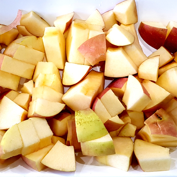 사과 반쪽을 1차 슬라이스 절단 후 2차 분할 절단에서 배출까지 한 번에 동작하는 다이스 절단 기계입니다.